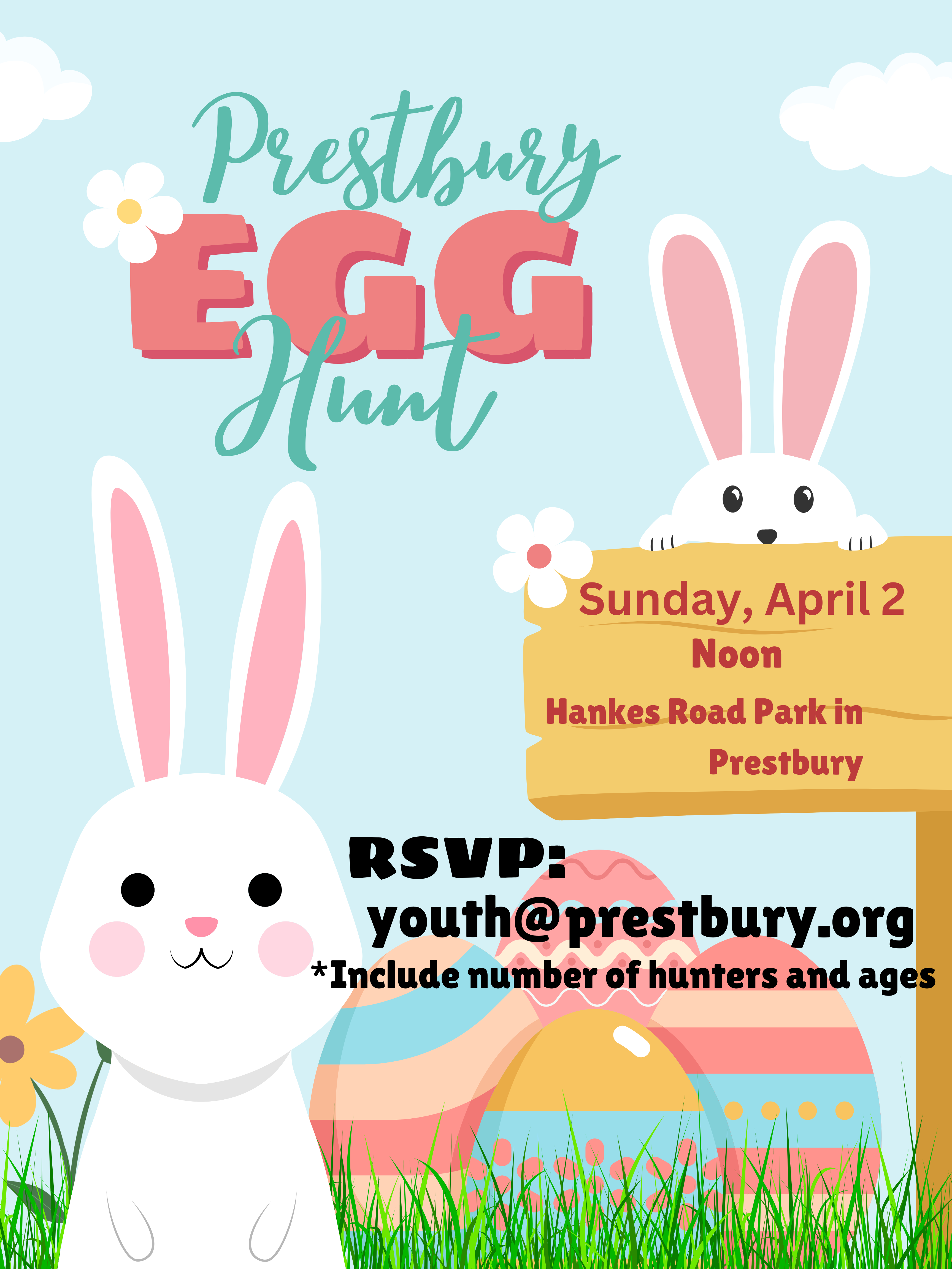 Prestbury residents are invited to an Easter Egg Hunt! Sunday, April 2 at noon at Hankes Road Park.